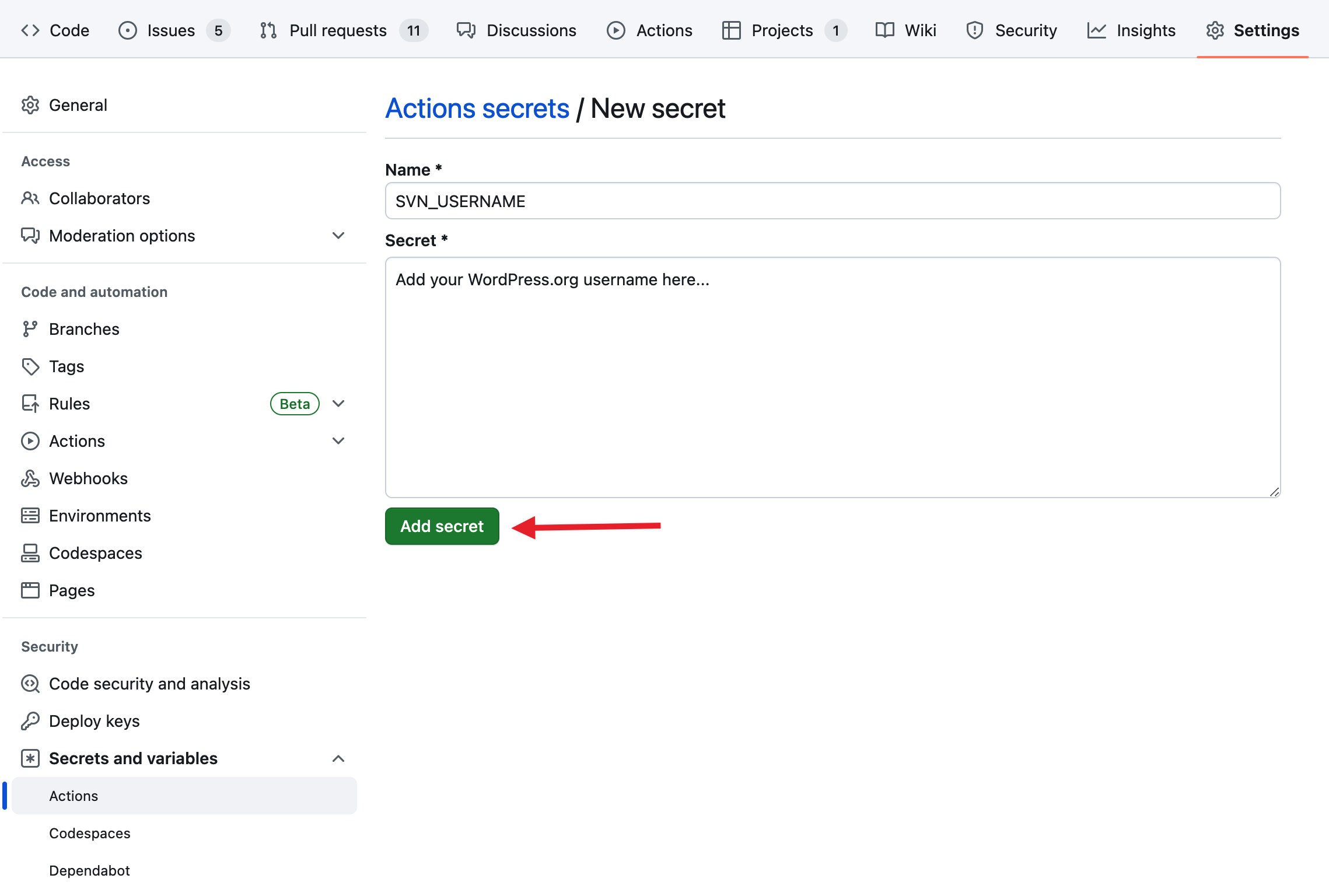 SLUG: ${{ secrets.PLUGIN_SLUG }}Step 3: Add the required Secrets to your repository
