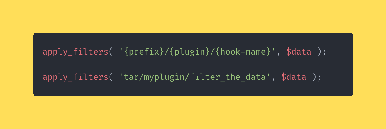 Already, just by looking at that filter name, you already know that it’s related to my plugin (tar is my initials so I often use it as a prefix) and it filters some kind of data.